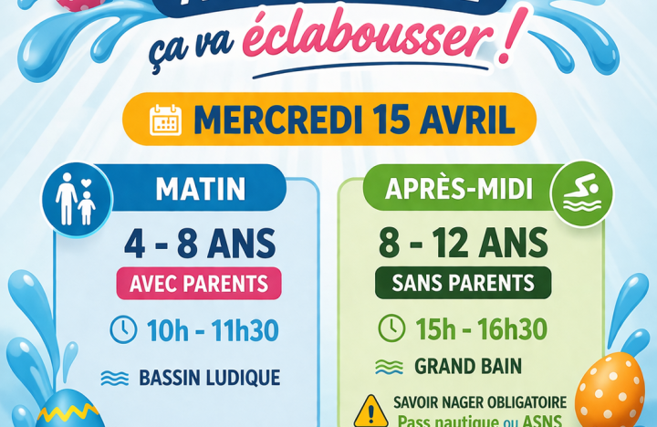 👉 Après-midi (8 – 12 ans) 15h – 16h30 – sans parents ⚠️ savoir nager obligatoire (Pass nautique ou ASNS)