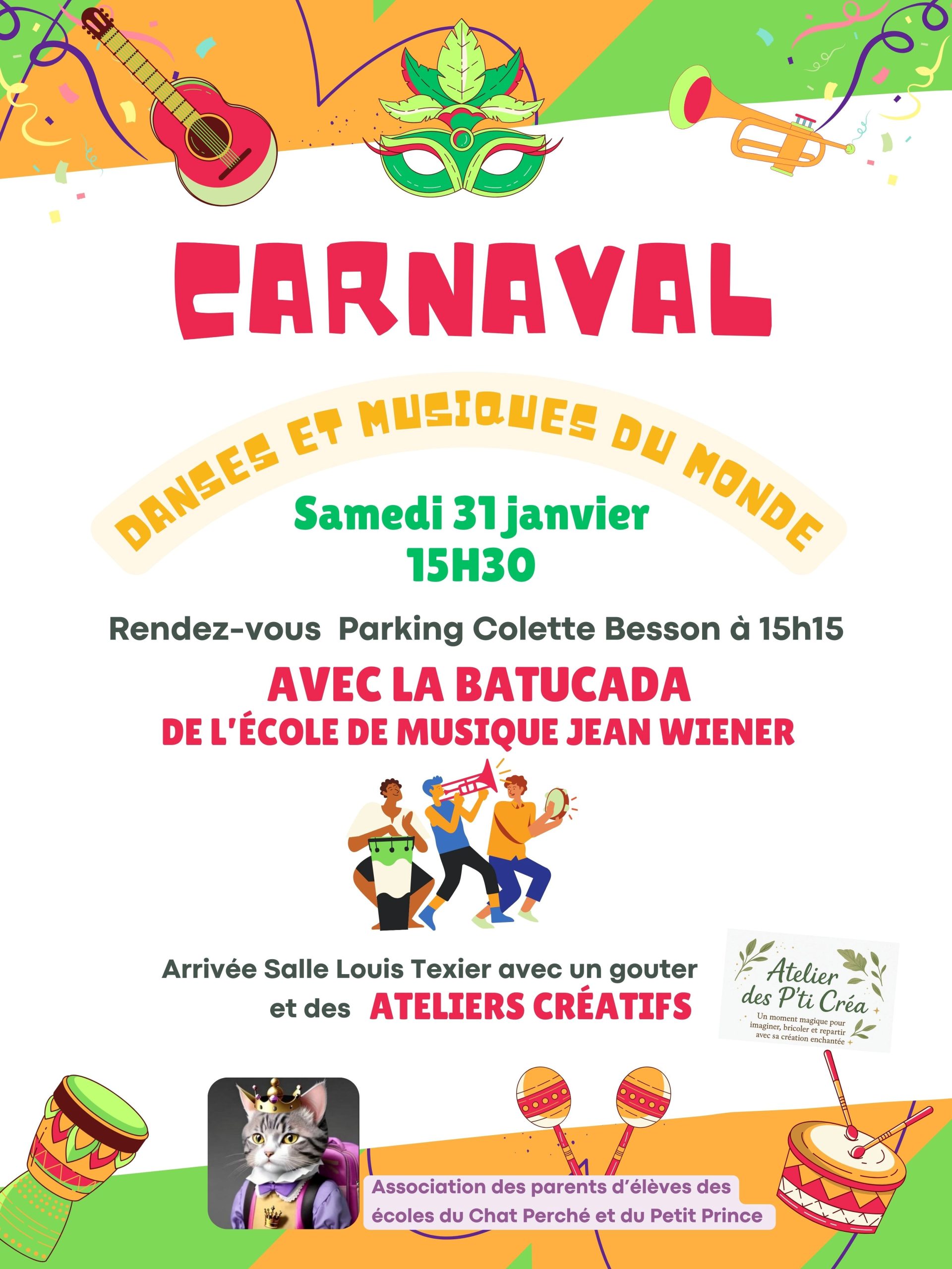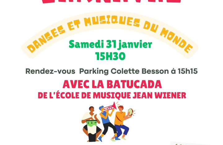 Rendez-vous parking Colette Besson dès 15h15, pour un départ à 15h30. Avec la batucada de l’école de musique Jean Wiener. Arrivée Salle Louis Texier avec un goûter et des ateliers créatifs pour cette après midi festive et musicale sur le thème des danses et musiques du monde! A la suite du Carnaval des écoles, vous serez invité·e à poursuivre les festivités avec les concerts organisés également Salle Louis Texier en soutien à la classe de mer des classes de CM1 du Chat Perché.