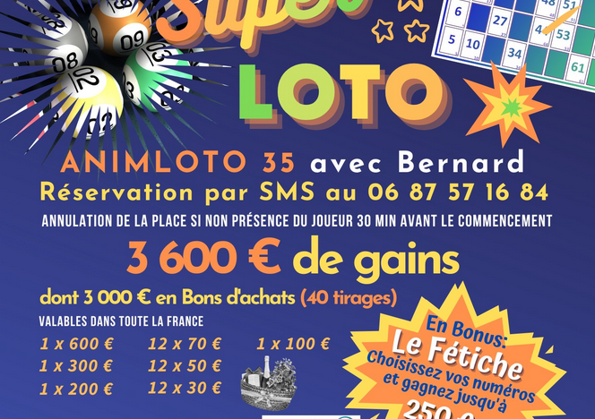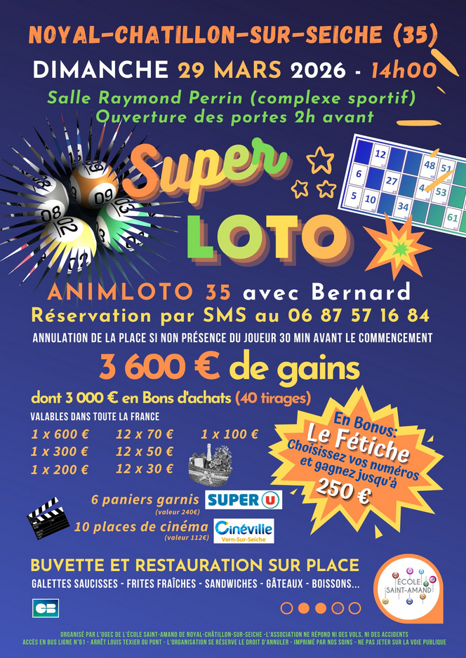 L’Ecole Saint-Amand organise un Super Loto animé par Anim’loto 35 le dimanche 29 mars 2026 (14h-18h) à la salle Raymond Perrin. 3500 € de gains dont 3100€ de bons d’achat ! Buvette et restauration sur place. Réservation par SMS au 06 87 57 16 84. Ouverture des portes deux heures avant. On vous attend avec plaisir !